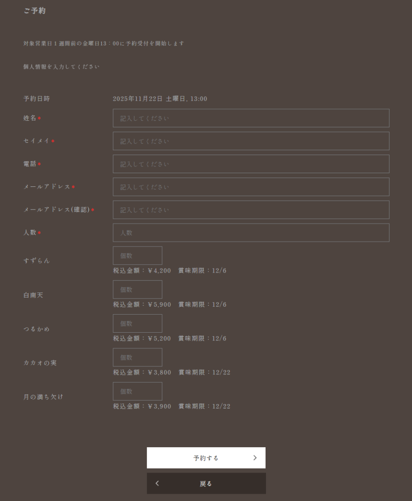続けてご入力いただきます。同時に、クッキー缶のご予約を承ります